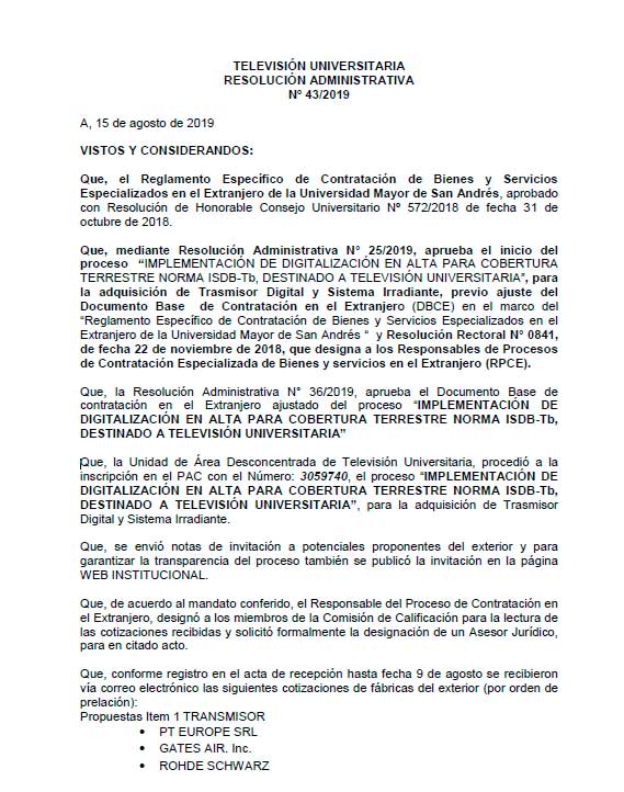 Se determina adjudicar, dentro del proceso IMPLEMENTACIÓN DE DIGITALIZACIÓN EN ALTA PARA COBERTURA TERRESTRE NORMA ISDB-Tb, DESTINADO A TELEVISIÓN UNIVERSITARIA para el Item 1 TRANSMISOR, a la fábrica ROHDE SCHWARZ por un monto total de $us. 116.374,58.- (Ciento dieciséis mil trescientos setenta y cuatro con 58/100 dólares americanos).