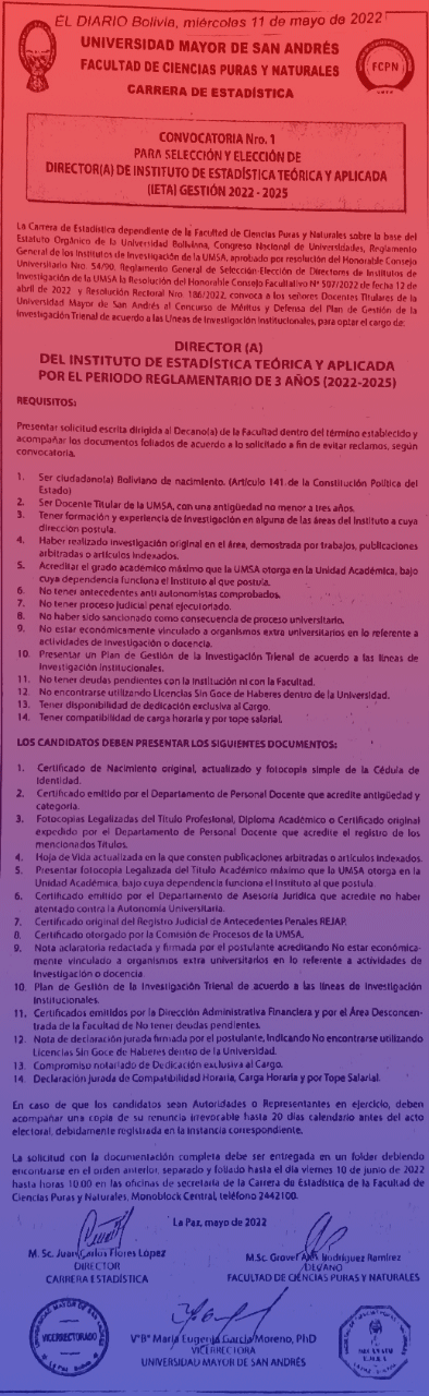 Conctactos: Cel. 73033059 WhatsApp Telf. 2442100 Dirección Carrera de Estadística UMSA