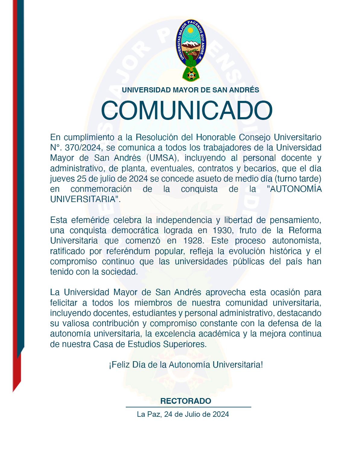 En cumplimiento a la Resolución del Honorable Consejo Universitario N°. 370/2024, se comunica a todos los trabajadores de la Universidad Mayor de San Andrés (UMSA), incluyendo al personal docente y administrativo, de planta, eventuales, contratos y becarios, que el día jueves 25 de julio de 2024 se concede asueto de medio día (turno tarde) en conmemoración de la conquista de la "AUTONOMÍA UNIVERSITARIA".